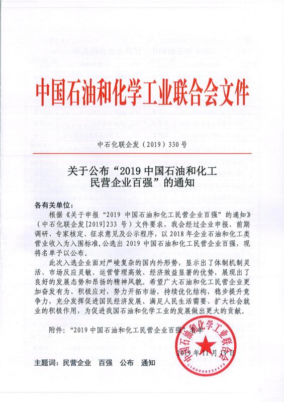 中國石油和化學(xué)工業(yè)聯(lián)合會近日發(fā)布了2019年中國石油和化工民營企業(yè)百強名單,我集團入圍,名列第66位。