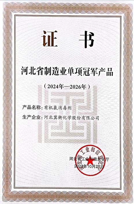 近日,河北省工業(yè)和信息化廳公布了《2024年河北省制造業(yè)單項冠軍企業(yè)名單》,河北冀衡化學股份有限公司憑借其在有機氯消毒劑行業(yè)領(lǐng)先的制造技術(shù)和全球領(lǐng)先的市場份額,榮獲“河北省制造業(yè)單項冠軍產(chǎn)品”稱號。